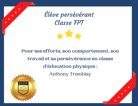 Élève persévérant Classe FPT Pour ses efforts, son comportemen , son travail et sa persév rance en classe d'éducation physiqu : Anthony Tremblay