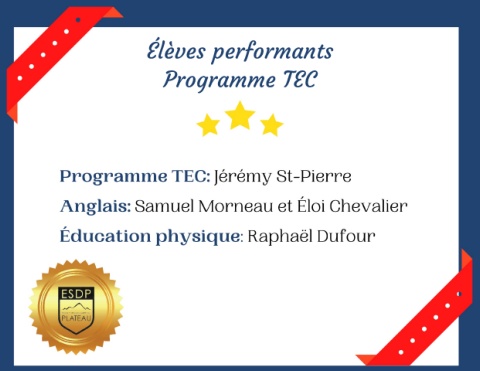 Élèves performants Programme TEC Programme TEC: Jérémy St-Pierre Anglais: Samuel Morneau et Éloi Chevalier Éducation physique: Raphaël Dufour